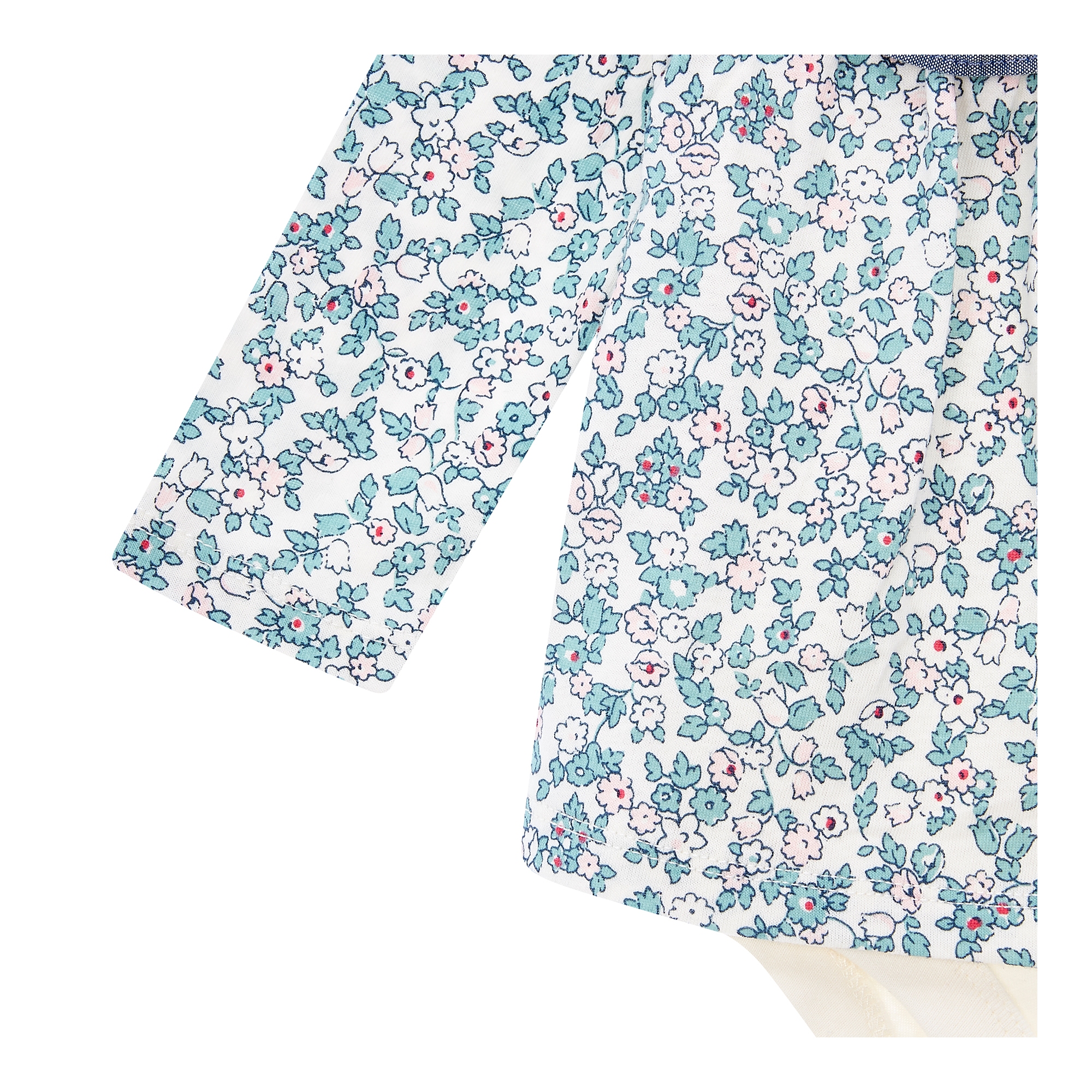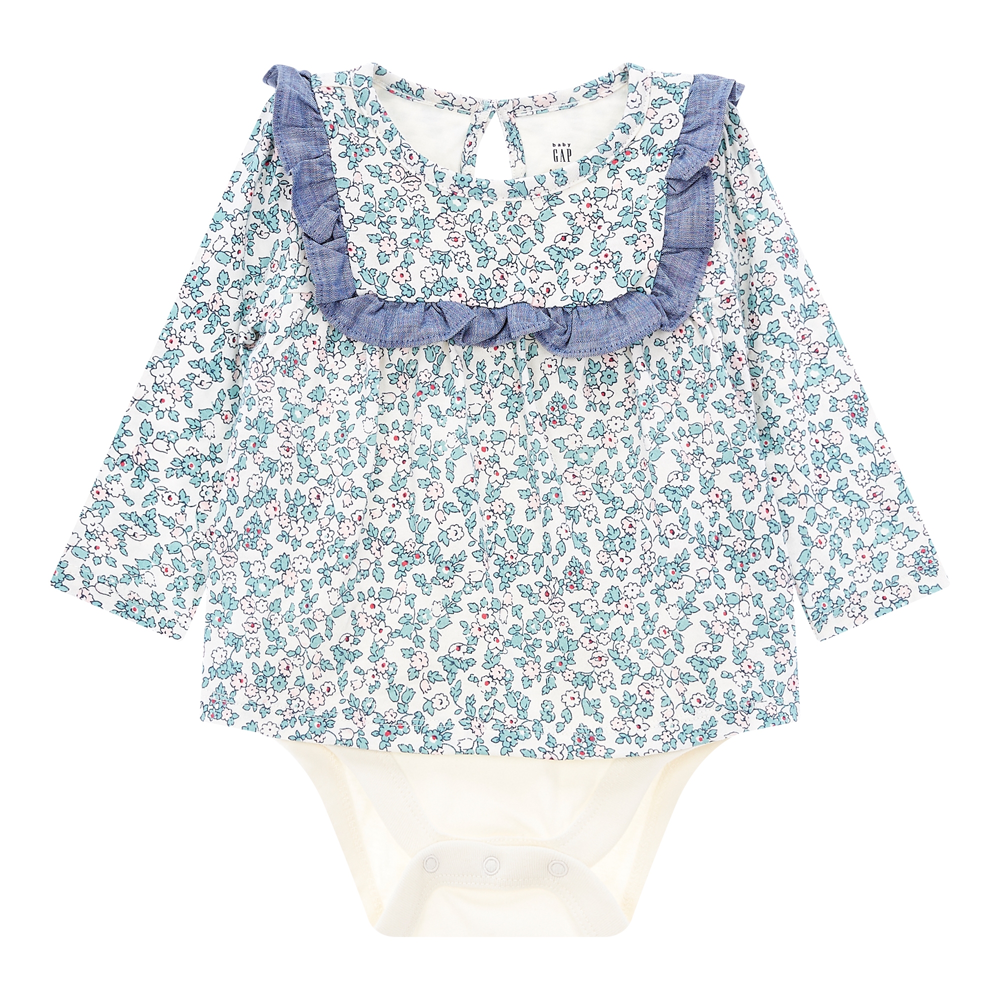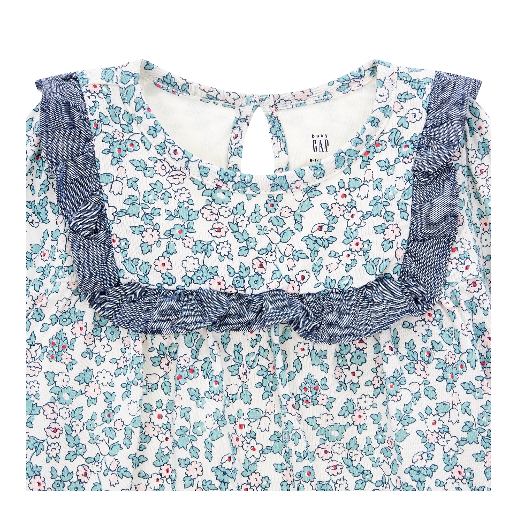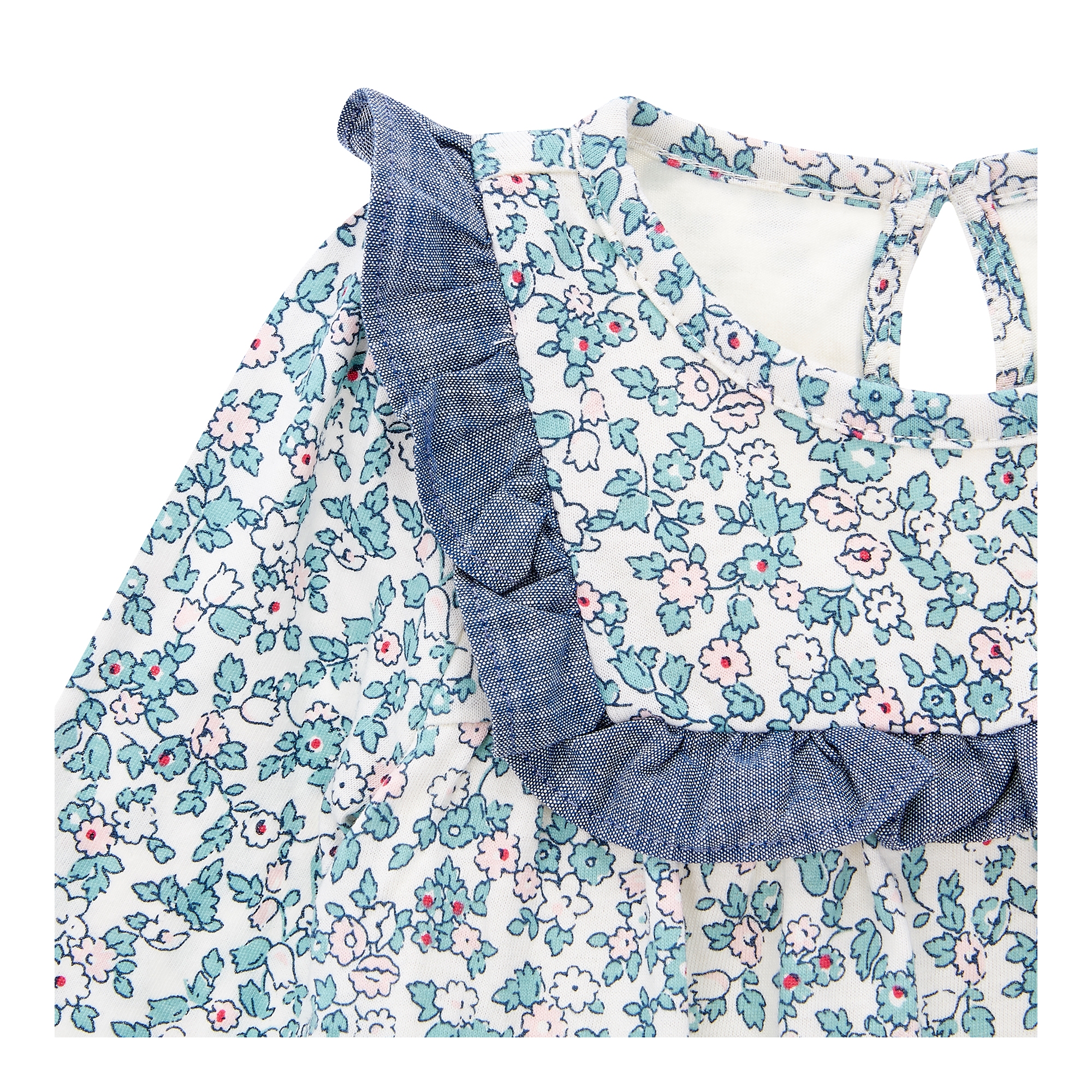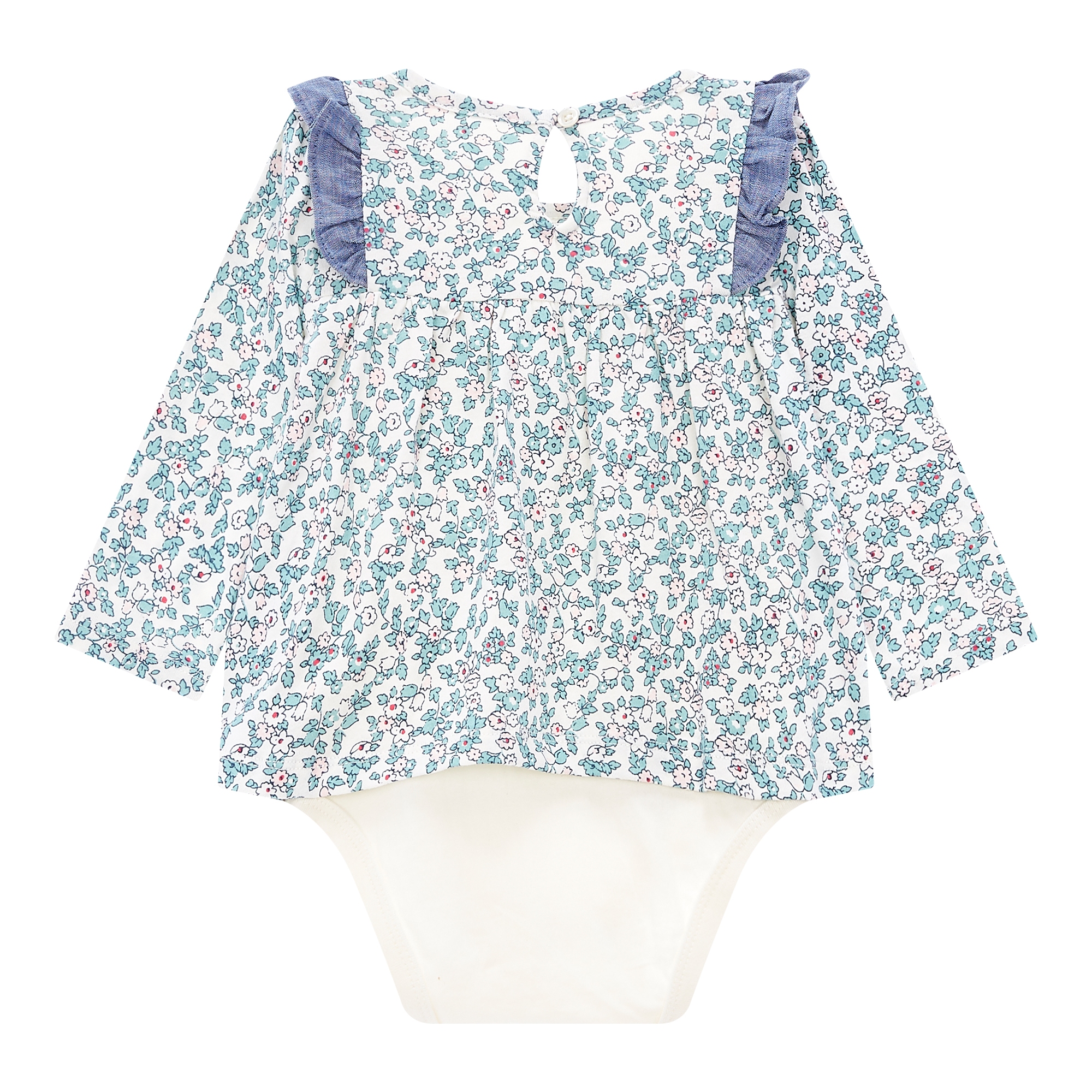 컬렉션 : 2018 Fall/Winter 디자인 포인트 : - 아기자기한 플로럴 프린트에 요크라인을 따라 샴브레이 러플이 있는 바디더블 스타일링 추천 : 단품 또는 저지 팬츠와 편안하게 착용