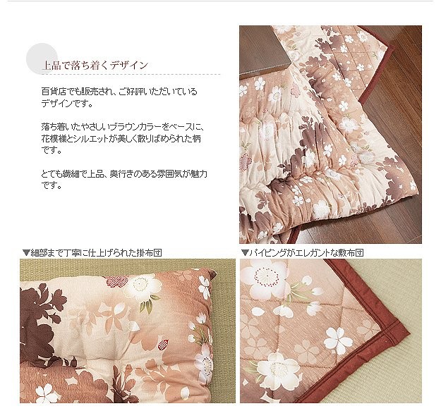 商品について:優しいブラウンカラーが上品な国産のこたつ布団セット。中綿を贅沢に使用しているため、暖かさが違います。クッション性に優れたお揃いのこたつ敷きでさらに暖かく、お部屋もトータルにまとまります。