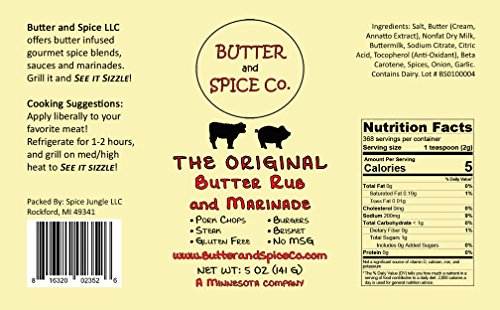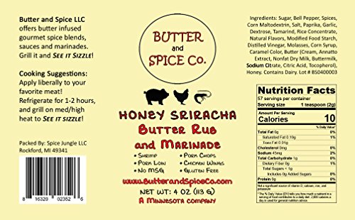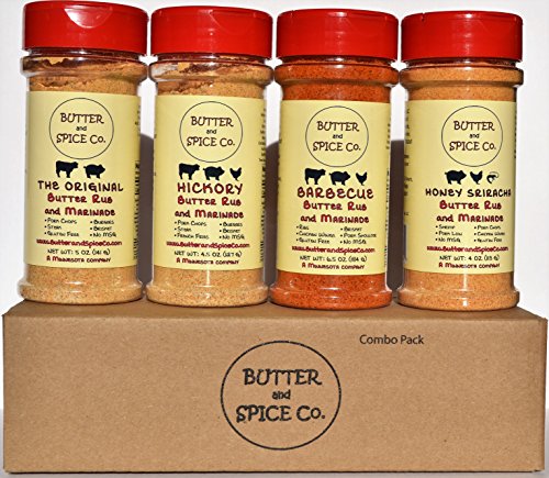 -. Feature : The Original Butter Rub-This zippy steak rub infuses real butter for a smoother tasting rub. Bold garlic, a touch of heat and hints of fennel round out this delicious seasoning. / Hickory Butter Rub- Light smoke flavor for a delicious finish. / Barbecue Butter Rub- Enhanced with real honey and molasses powders to replace much of the sugar normally found in BBQ rubs for a more natural sweetness. This rub was originally formulated for smoking pork ribs and pork shoulder. It is delicious on brisket also! / Honey Sriracha Butter Rub- Honey and Sriracha, what a wonderful combination. Sweet and Spicy! Real honey powder is used in harmony with chili pepper powder and other great flavors to create this multi-purpose rub! / All products are MSG free, all but Hickory Butter Rub are GLUTEN FREE.