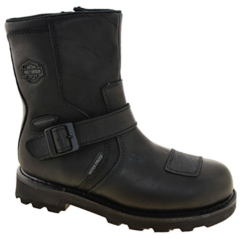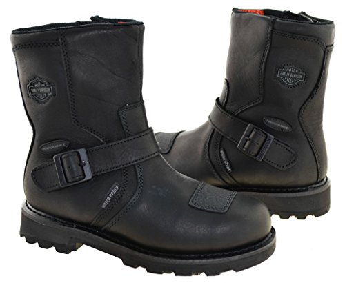 Studio : Wolverine Publisher : Wolverine Binding : Apparel Product Description Harley-Davidson® Riding Appropriate CE Certified Men's Blaine waterproof black leather motorcycle boots. Designed with full grain waterproof leather uppers, enhanced with a breathable Hydro-GuardTM membrane waterproof lining, Shock Absorbers Twin-PadTM Comfort Technology, and industry's best YKK® locking inside zippers with Velcro® closures for ease of putting on and taking off. The boots have a totally blacked-out body, with cross strap and black Harley® buckle, Waterproof and Performance badging, a black Harley® Bar Shield logo on the side of the boot, and abrasion resistant Tech-TuffTM overlays. Finished with the best oil-resistant, lightweight and flexible polyurethane midsoles, with rubber on the street side--providing the surest traction, comfort and performance possible. The boot's sole, insole and upper are bound using resoleable Goodyear® Welt construction processes, the most labor intensive and durable construction method available. 0