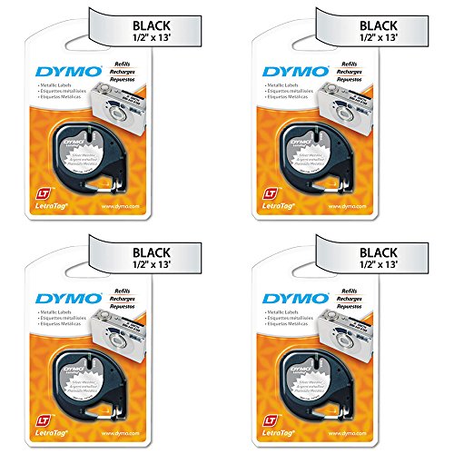 -. Title : DYMO LetraTag Self-Adhesive Multi-Purpose Label Tape, 1/2-inch, 13-foot Cassette, Black Print on Metallic Silver (1743603), 4 Packs