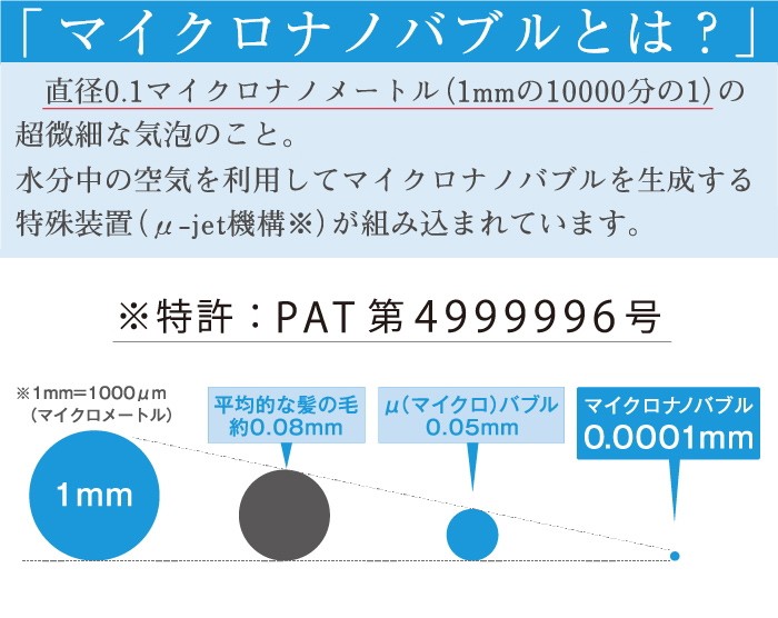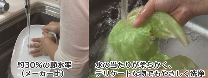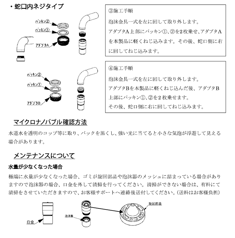 | 備考 | ・水圧が極端に低い地域では、水の勢いが悪くなり、マイクロバブルが発生しない可能性があります。 ・節水率は地域によって効果が出にくい場合があります。 ・通水時、本製品から「シャー」等の音が発生しますが、マイクロナノバブルが発生している音であるため、異常ではありません。 |