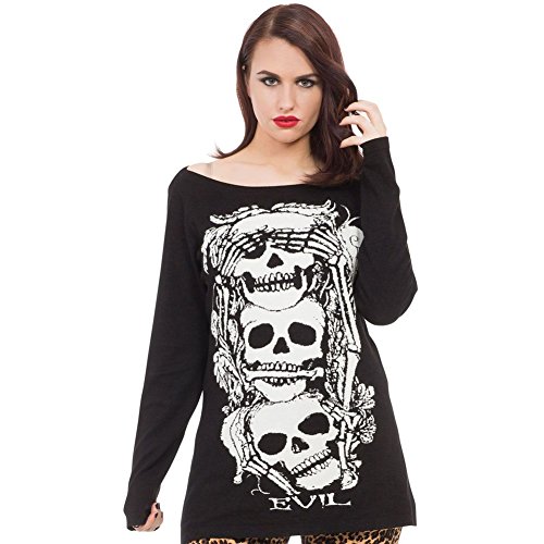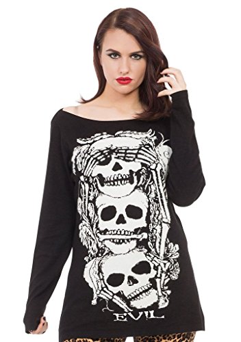 Studio : Jawbreaker Publisher : Jawbreaker Binding : Apparel Product Description No Evil Knit Sweater Women's Black By Jawbreaker. A comfortable knit sweater with a wide boat neck and extra long sleeves. The sweater comes in a long length and has a "No Evil" design on the front with skeletons playing the parts! 70%viscose 30%nylon 0