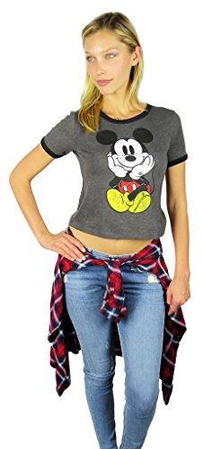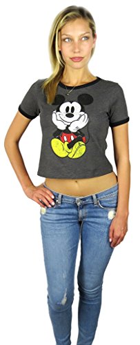 Disney Mickey & Minnie Mouse Womens Crop Ringer Tee Grey Heather...