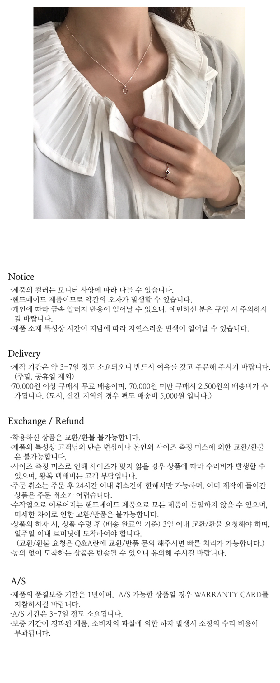 Silver color 제품은 무도금 제품이며, Rosegold color 제품은 핑크골드 색상으로 도금된 제품입니다. 도금 처리된 제품은 약품처리(은세척액)나 수분, 염분에 약하니 착용시 주의 바랍니다.