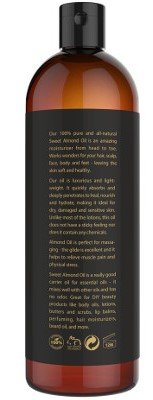 MOISTURIZING OIL: 100 Percent Pure Almond skin oil heals dry and sun damaged hair, skin and nails.