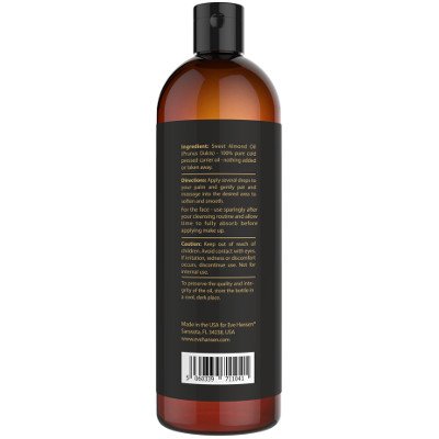 Unlike bitter almond, Eve Hansen's almond oil is 100% pure cold pressed almond oil from the sweet almond tree - prunus dulcis - which are known for their aroma and flavor. Use confidently and comfortably as almond extract is the only ingredient - with nothing added or taken away to preserve the oil's integrity. This liquid moisturizer and conditioner oil is the ideal product to heal dry, cracked, and damaged hair, skin, and nails. You may blend with other essential oils or simply use on its own for a therapeutic experience. Our almond oil organic is light-weight and luxurious. It absorbs quickly and deeply penetrates to heal, nourish, and hydrate, making it ideal for dry, damaged, and sensitive skin. Unlike most other oils and lotions, this oil does not leave behind a sticky and greasy residue, nor does it contain any chemicals. Sweet Almond oil organic is a favored massage oil that relieves muscle pain and physical stress. Eve Hansen's almond oil also makes the idea carrier oil for essential oil use. It mixes perfectly with other oils and is fragrance free. Great for DIY beauty products like body oils, lotions, butter, scrubs, lip balms, perfumes, hair moisturizers, beard oil, and more. One of almond oil's prominent uses - other than being a fantastic skin therapy lotion oil - is its ability to reduce the appearance of dark circles. Almond oil is a natural emollient - which means its known for calming and moisturizing the skin - and is so infused with vitamins, that it provides a large amount of nourishment to desired areas. In addition to relief from dry skin, brittle and think nails, psoriasis, and eczema, others have reported using Sweet Almond Oil for reducing wrinkles and fine lines. Almond oil can be used as a cleansing oil to prevent the clogging of pores and formation of blackheads. Gentle and safe for all skin types ranging from sensitive to dry. Use in home made lotions, butter, scrubs, lip balm, perfumes, shampoo, hair moisturizers.Feature