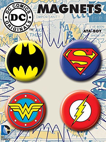 - Includes one each Batman, Superman, Captain America and Wonder Woman Logos button magnets; each magnet measures 1.25" in diameter