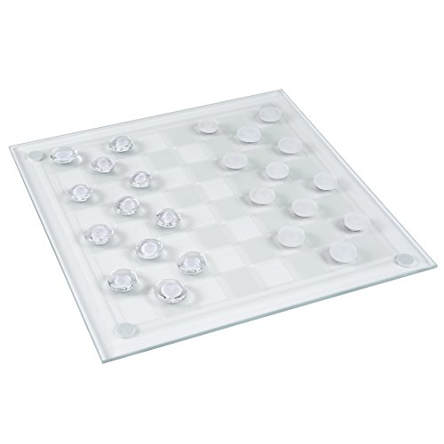 -. Feature : 16 Clear Chess pieces, 16 Frosted Chess pieces / 12 Clear Checkers, 12 Frosted Checkers / 9.75" Glass Game board with Foam Feet / Product Dimensions: 9.75 inches x 9.75 inches x .125 inches / King height: 2.25"