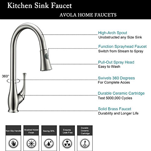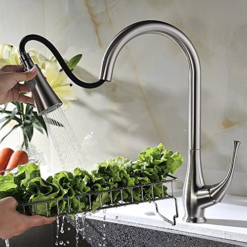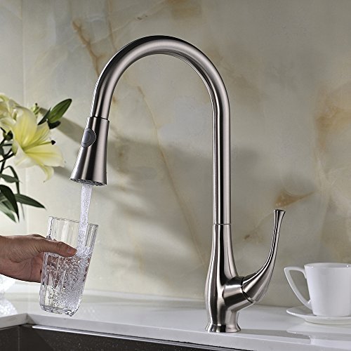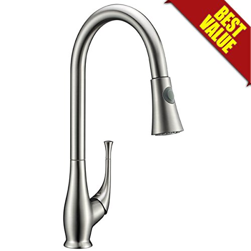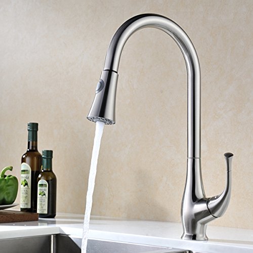 Avola Solid Brass Single Lever High Arc Pull Down Kitchen Faucet, Brushed Stainless Steel Single Handle Pull Out Sprayer Kitchen Mixer Faucet