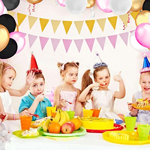-. Feature : WHAT YOU GET :100 Pack 12'' Latex Party Balloons (gold,pink and black and white colors) and 2- Pack gold and pink colors Pennant Banner Triangle Flag,the Flag Size: L 7.28'' X W 4.96'',Pennant string size: 8.2ft. / PERFECT FOR ALL OCCASIONS: Do you have a wedding celebration, birthday or pool party, anniversary celebration, baby shower or other special events that you want to decorate? Home Kitty gold, black, pink and white colors balloons are made of latex, and gold and pink colors triangle flags are all you need. The combination of shiny golden ,pink ,black ,white colors means they are perfect complements for all your events. / LONG LASTING AND STRONG: Home Kitty gold, pink ,black and white colors balloons are made from durable latex material, our gold color party balloons are very resistant and durable.You won't have to worry about them tearing or bursting when inflated. / FITS ALL OCCASIONS:gold,pink,black, and white colors latex balloons ,and gold and pink colors pennant banner triangle flag is perfect for glamorous party themes such as baby shower,anniversary celebrations, dances, birthday or pool parties,Cinco de Mayo,4th of July,fiesta party,New Year's Eve, Christmas,wedding, or a simple get together for the girls on a Friday night. / HIGH VALUE FOR MONEY: With 100 pieces of gold, pink, black, and white colors latex party balloons, you can plan a lot of parties without having to order more balloons. What more? Our party balloons and pennant banner triangle flags are reusable.The pennant banner triangle flags are easy to hang them on the wall, above the table, in hallway,tree, among other places, giving you high value for money spent.