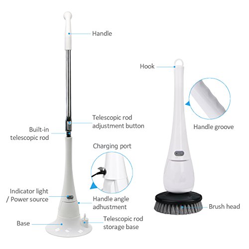 Product Description The functional cordless powerful scrubber is an exclusive patent cordless power cleaning machine with telescoping disassembly and IPX7 waterproof technology. Recycle base convenient to place the cleaner and tube, Safely and easily clean the tops of shower stalls and other places.