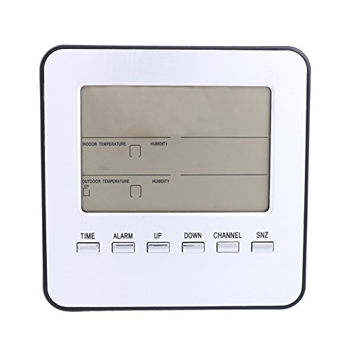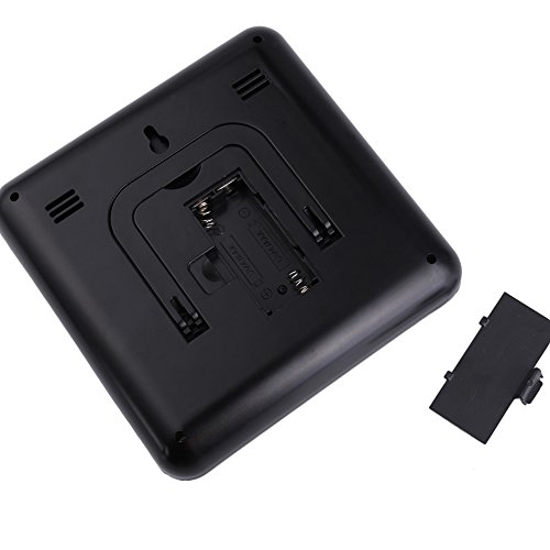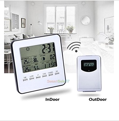 -. Feature : Digital thermometer with wireless remote. Accurate data from the outdoor transmitter updates every 35 seconds. / The smart digital thermometer can recognize the indoor and the outdoors temperature, humidity, moon phase, date, hours and sight of the weather (sunny, sunny cloudy, cloudy, rain). / Easy to read large LED screen with artful design for a fast understanding of the current weather. Easy setting so everyone can use it and read it. / Battery Powered and 6-month Warranty: Require 4 AA batteries (Not included) (2 for the Weather Station and 2 for the Transmitter), which can be easily purchased anywhere. No more unsightly wires in your home! Offer 6-month Quality Guarantee free. / The digital thermometer comes with a wireless transmitter within 330ft range.