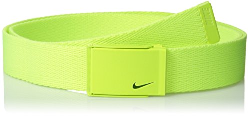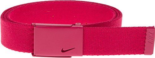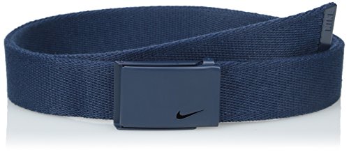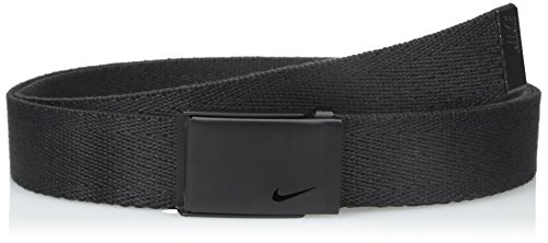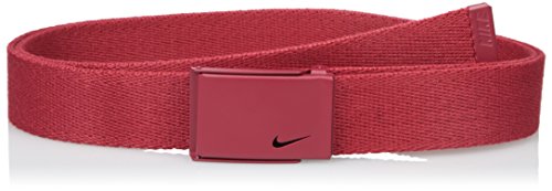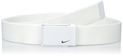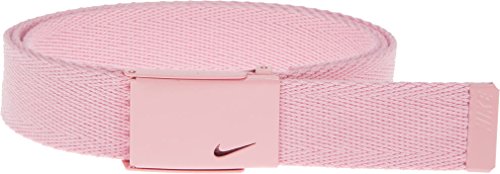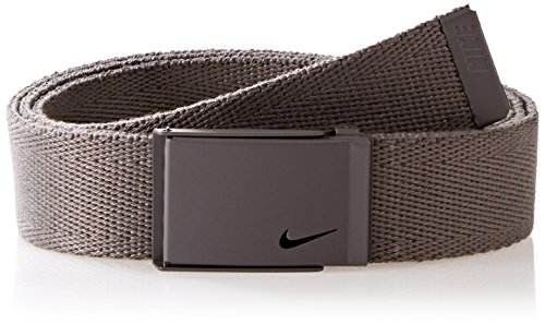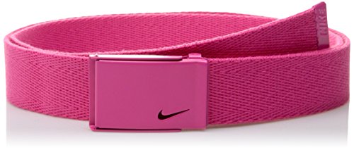 Webbing with tonal enamel clamp plaque buckle with cutout swoosh logo.