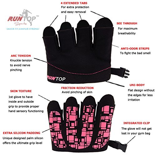 -. Feature : IMPROVED DESIGN - Adding RUNTOP exclusive designed silicon padding make your hand stronger and stability on the bar rings and ropes .Adding Adding clip to make your grips not get lost in the GYM during Crossfit Workout Fitness Exercise Weight Lifting Bodybuilding Powerlifting Training .The top of the Gripper glove is constructed with form fitting lycra which allows your hands to breathe to prevent overheating / EXTREME LIGHT WEIGHT - The only gloves crafted to provide the best hand protection & natural hand sensory functionality. / SUPER COMFORTABLE - Fit & Barehand Feeling , non padded no strap Ultralite / EASY REMOVAL- 4 Extended Tab for Extra Protection and Easy on and off / PERFECT EQUIPMENT - For Rope climbing, chin ups, pull ups, bodybuilding, deadlifts, dumbbells, kettlebell