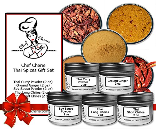 -. Feature : Gift Set includes: Thai Curry, Powder Ground Ginger, Soy Sauce Powder, Thai Long Chilies, Thai Short X-Hot Chilies / Never any MSG or fillers. Our spices are 100% pure. / Our manufacturer custom packs all orders by hand so you know your spice is fresh. / A perfect gift for any home cook or aspiring chef. / Comes in convenient 2 oz. tins for easy use and storage.
