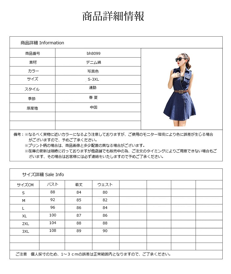 ■素材:デニム綿■カラー:写真色■サイズ:S着丈84バスト88ウェスト80M着丈85バスト92ウェスト82 L着丈86バスト96ウェスト84XL着丈87バスト100ウェスト862XL着丈88バスト104ウェスト883XL着丈89バスト108ウェスト90■原産地:中国