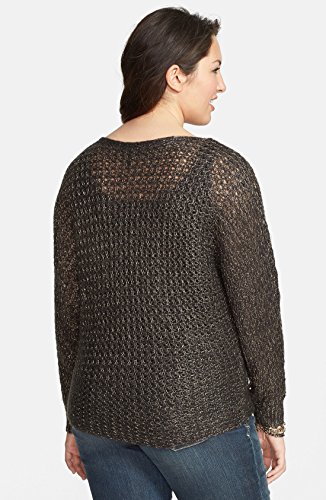 Womens plus size knit pullover. Long sleeve. Scoop neckline. Open weave, metallic shimmer.