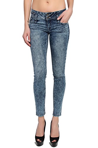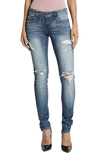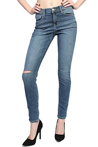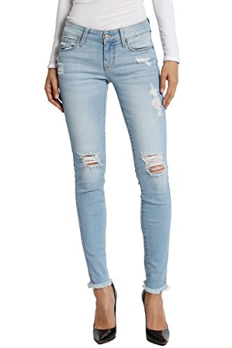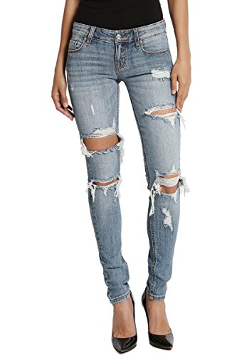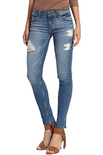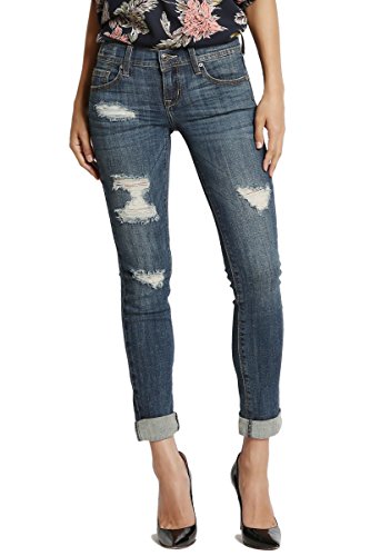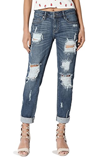 Medium indigo wash with fading and whiskering, distressing relaxed boyfriend jeansMid rise; straight fit through hips and thighs; straight legFive pocket styling, Belt loops ; Zip fly with button closureMeasured from size 5 : 31" low waist, 8.75" rise, 12.5" leg opening, 27" unrolled inseam(can be rolled)Model size : 5'3" height, 33" bust, 25" waist, 34" hip, and is wearing a size 0, Fits true to size, take your normal size99% cotton 1% lycra ; Machine wash cold, Low Iron if NecessaryNOTICE: Before order, please carefully read the Size Chart we provided in the pictures (Not Amazon size chart)