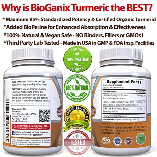 WHY NEW BIOGANIX TURMERIC CURCUMIN 95? - Not only is our Curcumin 1000mg Certified Organic with the highest Potency (95% Curcuminoids) and BioPerine for enhanced absorption, Our Doctor Trusted product is Gluten-Free, Made in the USA, In FDA and GMP approved facilities - Third Party Tested and Verified.