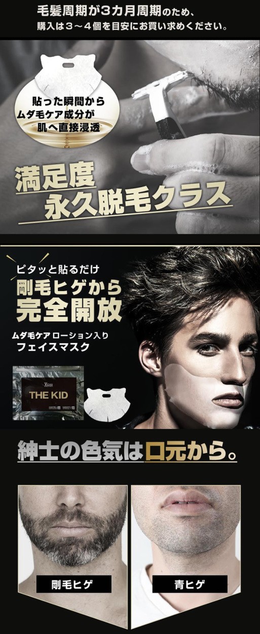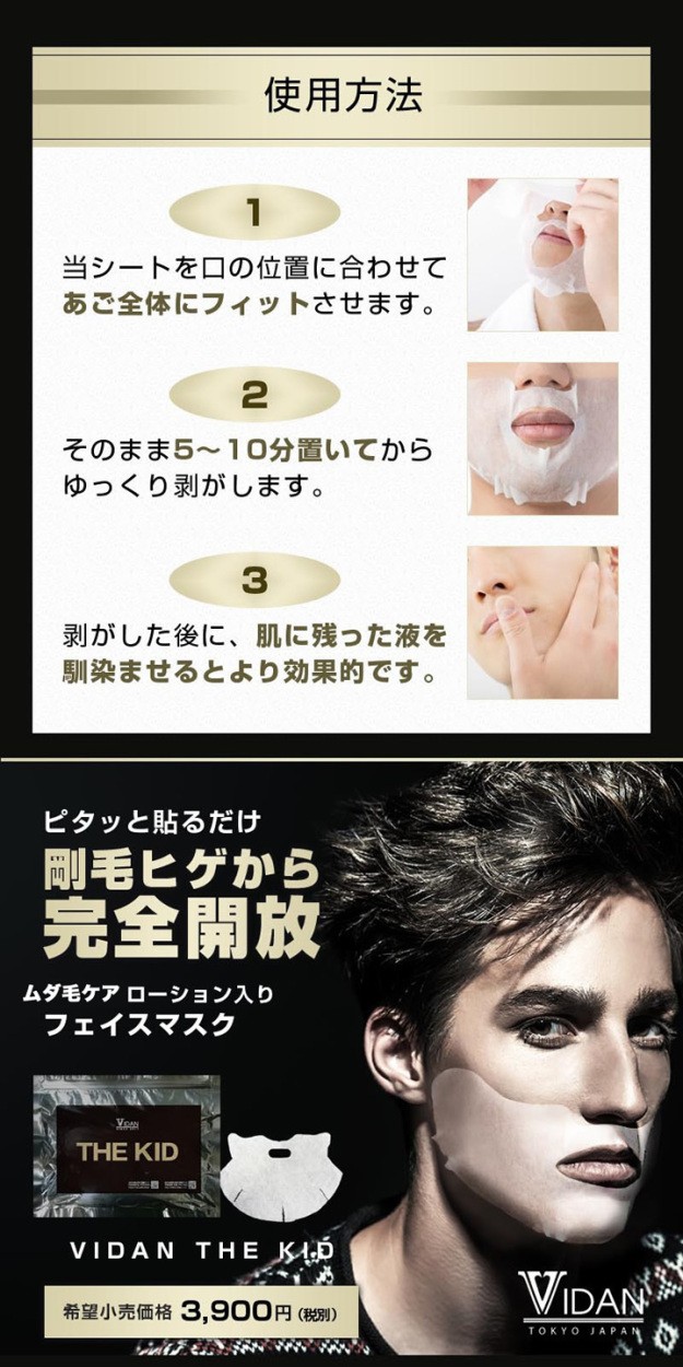 | 使用方法 | 1.シェービング後、袋からマスクを取り出し、ていねいに広げてください。 2.最初に口の位置を合わせ、あご全体にフィットさせてください。 3.そのまま5~10分おいてから、ゆっくりはがします。 4.はがした後にお肌に残った液を手のひらでなじませますと、より効果的です。 |