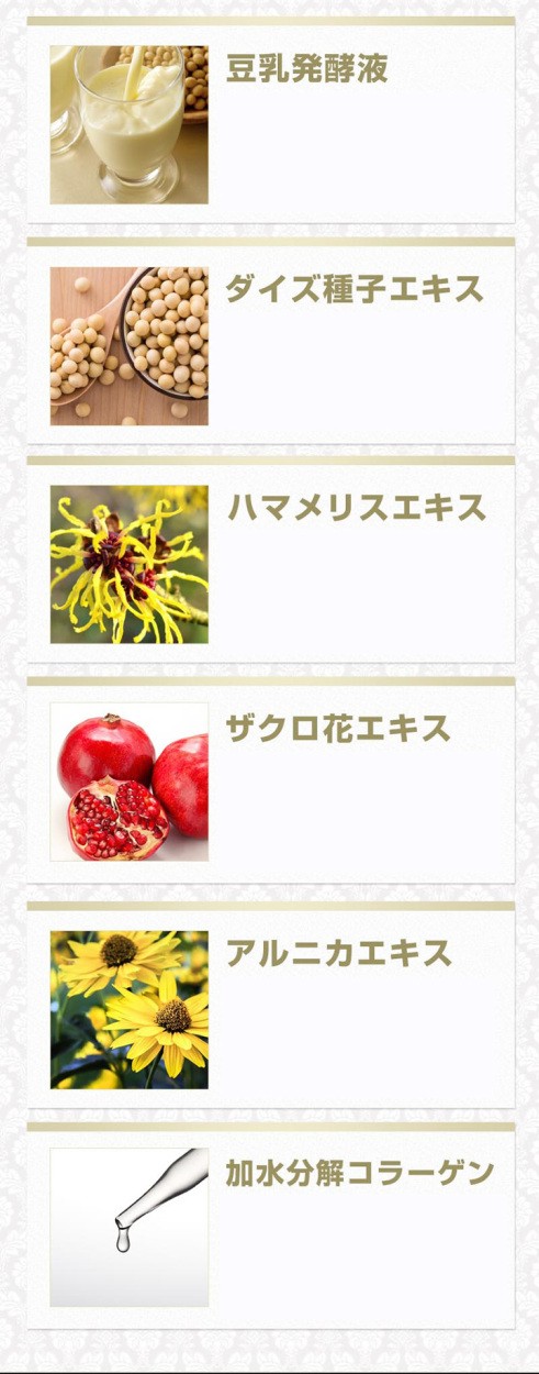 | 成分 | 水、グリセリン、BG、DPG、ペンチレングリコール、ヒアルロン酸Na、ヒアルロン酸ヒドロキシプロピルトリモニウム、加水分解ヒアルロン酸アルキル(C12-13)グリセリル、加水分解コラーゲン、水溶性プロテオグリカン、豆乳発酵液、加水分解ダイズタンパク、ダイズ種子エキス、アルニカエキス、ハマメリスエキス、セイヨウオトギリソウエキス、セイヨウシロヤナギ樹皮エキス、ザクロ花エキス、アラントイン、ジヒドロミリセチン、PG,PEG-40水添ヒマシ油、メントール、キサンタンガム、サリチル酸、尿素、亜硫酸水素Na、EDTA-2Na、メチルパラベン、ブチルパラベン、エチルパラベン、プロピルパラベン、イソブチルパラベン、フェノキシエタノール |