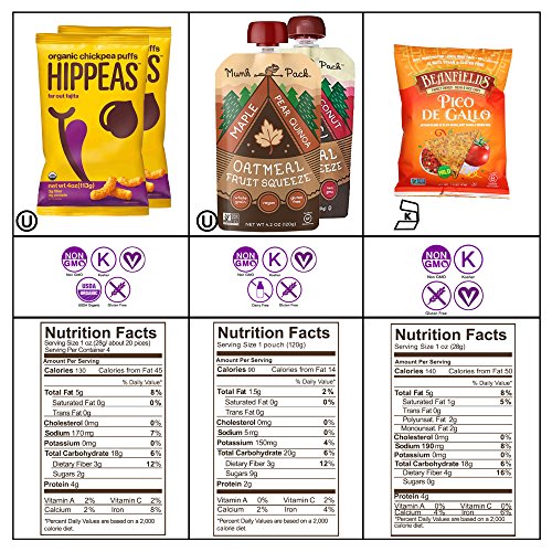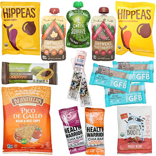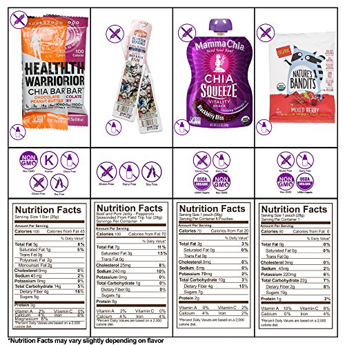 This box includes High protein vegan oatmeal squeezes for a burst of energy at breakfast. Plant-based chia seed fruit squeezes for a protein kick during lunch. Savory chickpea puffs & bean and rice chips to satisfy salty cravings. Natural free-range jerky, varieties of vegan portable on-the-go high protein low sugar bars to fill in your hungry hours. We guarantee that you will find the best-certified gluten free, dairy free, high protein low sugar, high omega 3-6- and 9 enriched, superfood snacks!