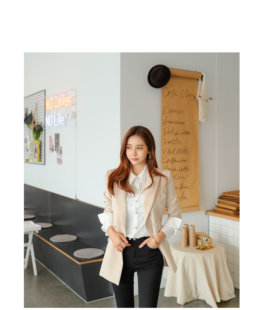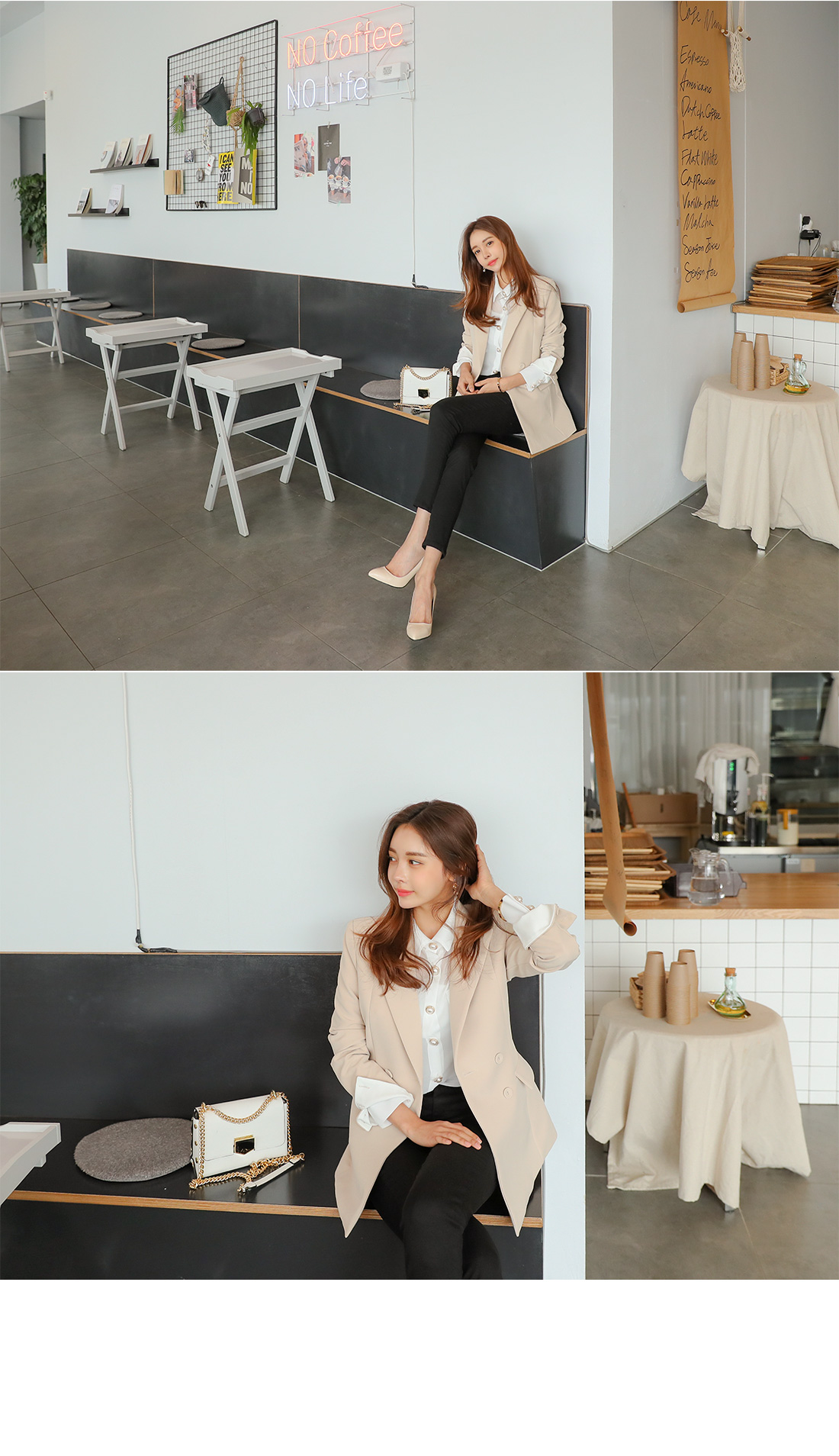어깨에는 패드가 내장되어 있어 안정감 있는 실루엣이 연출되구요