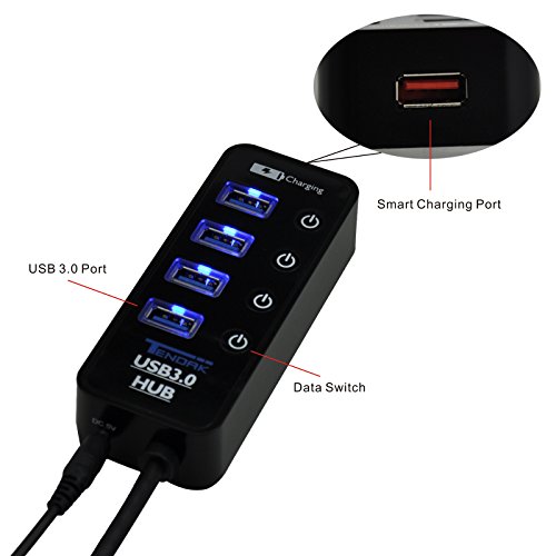 Tendak Smart Charger SuperSpeed USB Hub with 4 USB 3.0 Data Ports + 1 Smart Charging Port (5V/2.1A) with 5V 3A Power Adapter Blue LED Switcher