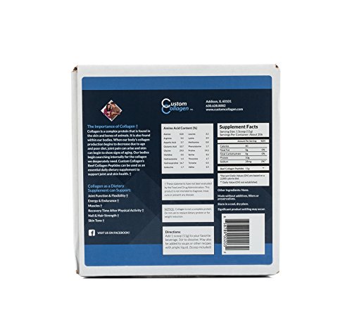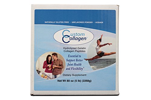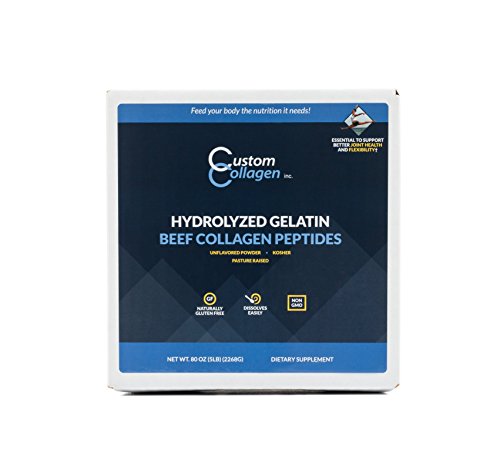 -. Binding : Health and Beauty -. Brand : Custom Collagen -. EAN : 0850967004043 -. Feature : Commonly used for joint pain, hair and nail strength, and skin tone! / Raw material is source from pasture-raised, South American cattle. / Use this as an alternative to soy or whey protein. Each scoop contains 10 grams of protien! / Commonly used for illnesses such as leaky gut syndrome, celiac disease, and hashimotos. / This is produced by Custom Collagen - a Family owned and operated gelatin manufacturer with over 40 years of experience. -. Label : Custom Collagen -. Manufacturer : Custom Collagen -. PackageQuantity : 1 -. ProductGroup : Health and Beauty -. ProductTypeName : HEALTH_PERSONAL_CARE -. Publisher : Custom Collagen -. Studio : Custom Collagen -. Title : Custom Collagen's Hydrolyzed Gelatin | Collagen Peptides 5lb (80oz) Box Kosher Unflavored Powder -. UPC : 850967004043