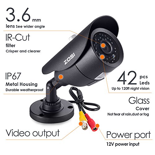 -. Title : ZOSI 1/3" CMOS 1000TVL 960H CCTV Home Surveillance Weatherproof 3.6mm lens with IR Cut Bullet Security Camera - 42PCS Infrared LEDs, 120ft IR Distance, Aluminum Metal Housing
