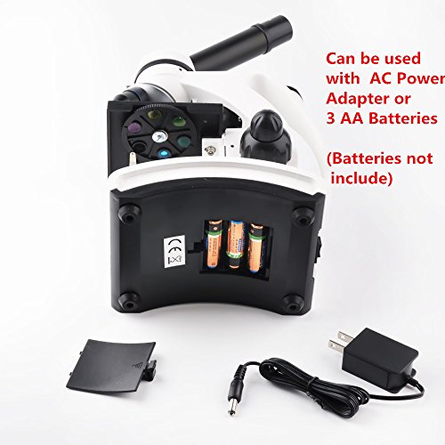 The microscope is powered by a 110VAC adapter (included) or by three AA batteries (not included) for field use. The microscope includes five blank and five prepared slides. The microscope includes Smartphone Adapter, to Capture Beauty in the MicroWorld.