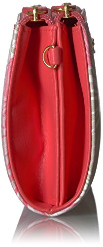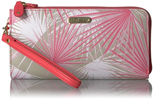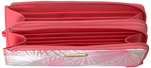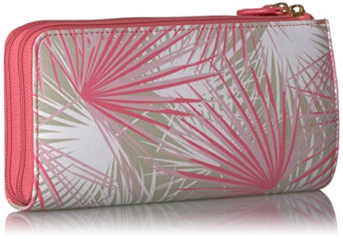 Custom printed faux leather with faux leather trim and tab puller and satin goldtone logo plaque/hardware tropical palms double l-zip wristlet features a two sided zip compartment.