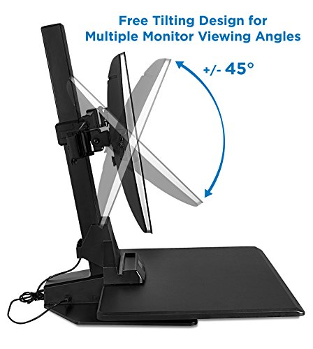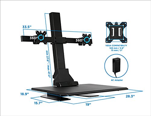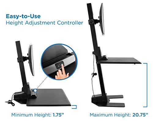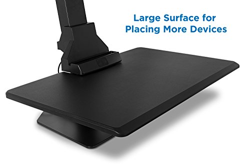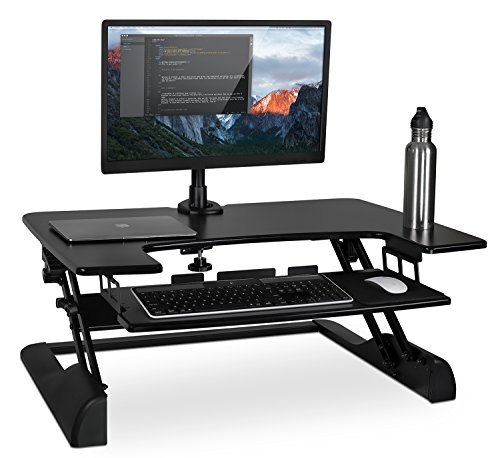 -. Feature : SIT TO STAND - Adjustable height standing desk workstation allows you to work sitting and standing throughout the day. Stepless height adjustment allows a comfortable standing or sitting position. Just squeeze the side handles and go from sitting to standing in seconds. / EASY and QUICK TRANSITION - Go from sitting to standing in one easy smooth motion. Spring lift mechanism assists with the lifting motion, even with your computer and monitor on it. The sit-stand desk goes from 5.25 inch high to 19.75" inch high. / SPACIOUS WORK AREA - The top surface measures 35" x 25" providing plenty of space for single monitor, dual monitor, and laptop + monitor setups. The secondary surface has enough space to fit a keyboard and a mouse. / ERGONOMIC KEYBOARD TRAY - Ergonomic keyboard tray keeps staggered height between keyboard and monitor to prevent neck strain without manual adjustments of sitting or standing. The tray is large enough to keep keyboard and mouse side by side and raises and lowers with the top surface. Weight capacity for the entire desk is 33 lbs / NO ASSEMBLY REQUIRED - Use your desk right out of the box! Place on your existing desk and start organizing your workstation