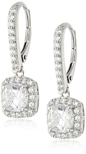 -. Title : Platinum-Plated Sterling Silver Swarovski Zirconia Square Radiant Halo Drop Leverback Earrings