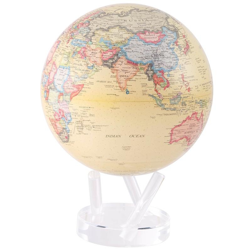 外側のアクリルの球体ケースの中に少し小さい地球儀が入っている二重構造。その2~3mmの隙間には特殊な液体が充填されていて中の地球儀だけがスムーズに回転します。電池や電源を一切使わずに、ソーラーエネルギーと地球の磁場・重力を利用し半永久的に自転します。 |