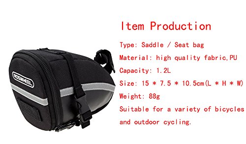 Specifications: 1. Size: 15 * 7.5 * 10.5cm(L * H * W) = 5.9 * 3 * 4in 2. Weight: 88g = 0.2lbs 3. Capacity: 1.2L 4. Material: high quality fabric and PU 5. Color: Black 6. Type: Saddle / Seat bag 7. Installation: Strip with buckle,velcro strip Features: ★ Fashion design and convenient to carry.Suitable for a variety of bicycles and outdoor cycling. ★ Suitable for packing cell phones, money, key or ID card, etc. ★ Bag have a hanging device for rear light. ★ Double sides with PU material design provides high quality and makes it easy to clean. Package includes: 1 * Bicycle Saddle Bag Any problem, please feel free to contact us first and we will supply the best serviceFeature
