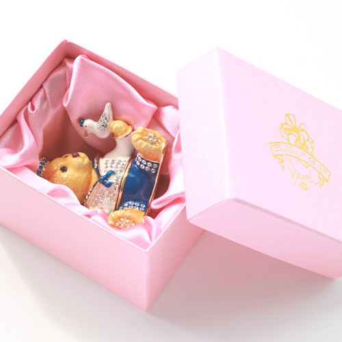 | ジュエリーボックスと言えば、指輪やピアス、ネックレスなどのアクセサリーを入れる引き出し型のケースを思い浮かべる方が多いかもしれません。 ピィアースのジュエリーボックスは、動物や花などをモチーフに作られ、合金製でずっしりとした重さがあります。また高品質のクリスタルガラスを贅沢に使用。まるでジュエリーボックスそのものが宝石のような、高級感溢れる仕上がりです。 小物入れとしても使えるように開閉口には磁石が取り付けてあり、アクセサリーなどなくしやすいアイテムの収納ができます。キラキラと美しく輝く宝石箱は、そのまま飾って楽しめるインテリア雑貨として多くの方に愛されています。 国内トップクラスのジュエリーボックスメーカーであるピィアースは、2004年ごろから本格的に宝石箱の製造を始め、現在のジュエリーボックスはなんと300種類以上。大規模展示会でもご好評いただいており、全国有名百貨店でも販売されています。 自社工場でひとつひとつ丁寧に手作りし、原型作成、研磨、加工、着色、小さなクリスタルガラスの取り付けなども全て手作業で行われるこだわりのハンドメイド品。完成後は厳しい検品の後、丁寧に梱包作業をしお客様にお届けしております。 ピィアース商品は、全国有名百貨店および全国有名宝石店チェーンにてお取り扱いいただいている高品質商品です。 ★自分へのご褒美に…コレクションして並べて飾ると、さらにかわいらしさUP! ★恋人へのプレゼント…中にアクセサリーを入れて、サプライズな贈り物として ★家族への感謝ギフト…お母さんや姉妹へ、日頃のありがとうの気持ちを込めて ★誕生日プレゼント…お友達の喜ぶ顔が見たいから、いつもと違うキラキラギフトを ★小さな女の子へ…まるでお姫様が使っているようなキラキラ宝石箱は女の子の憧れ! |