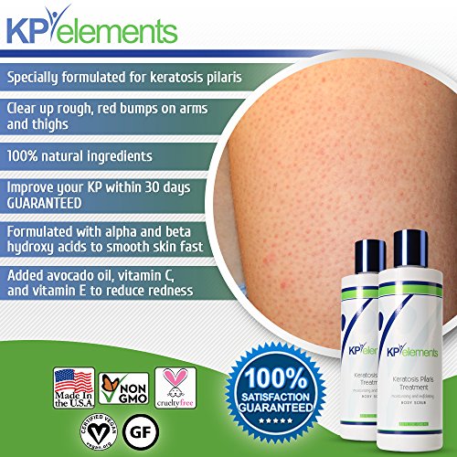 -. Feature : ALL NATURAL KP BODY SCRUB for Treatment of Red Bumps on the Arms and Thighs also known as Keratosis Pilaris, or Chicken Skin / EXFOLIATES NATURALLY - Removes excess keratin and helps your skin heal without the use of harsh or irritating chemicals - Smooths your skin, naturally! / DERMATOLOGIST TESTED AND APPROVED - Have confidence in the product you are buying! / CONTAINS ALOE VERA EXTRACT, Jojoba Seed Oil, Vitamin A, and Vitamin E to cleanse skin and reduce bumps - Manage Your Keratosis Pilaris with KP Elements Body Scrub Today! / Most Effective when combined with our KP Treatment Cream - 100% Satisfaction Guaranteed!