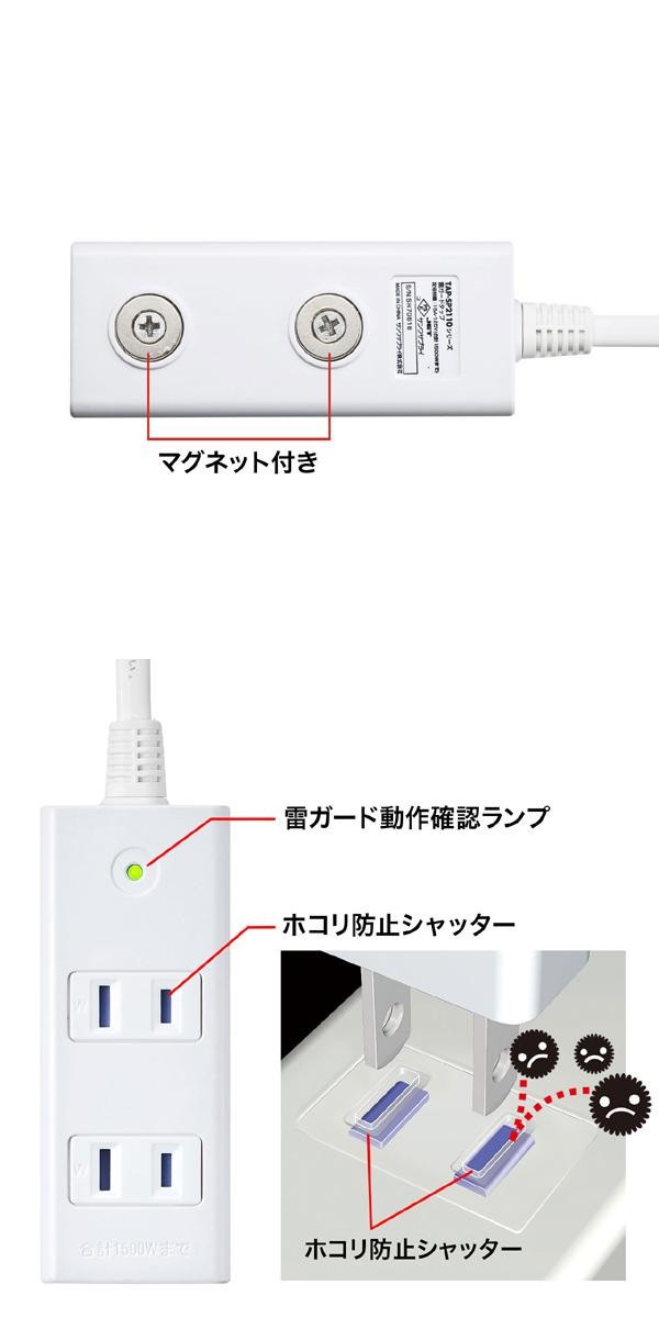 雷ガードを内蔵しており、接続機器を雷から守ります。雷ガード作動中は確認ランプが点灯します。スチール机に仮固定できる便利なマグネット付き!