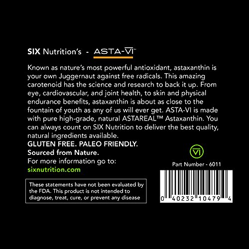 Known as nature's most powerful antioxidant, astaxanthin is your own Juggernaut against fee radicals. This amazing caratenoid has the science and reserach to back it up. From eye, cardiovascular, and joint health, to skin and physical endurance benefits, astaxanthin is about as close to the fountain of youth as any of us will ever get. ASTA-VI is made with high-grade, natural ASTAREAL TM Astaxanthin. You can always count on SIX Nutrition to deliver the best quality, natural ingredients available.