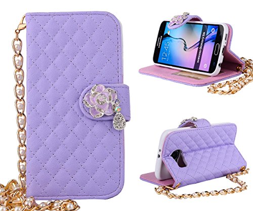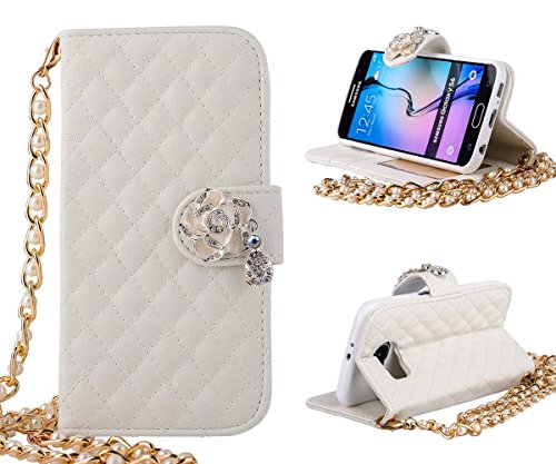 S6 Case,Galaxy S6 Case,Welity Camellia Bling Rhinestone Diamond Buckle Peral Wristlet Chain Premium PU Leather Flip Folio Book Style Wallet Protector Skin Pouch Phone Case & Magnetic Closure [Credit/ID Card Slot] [Kickstand Feature] [and One Gift] Co