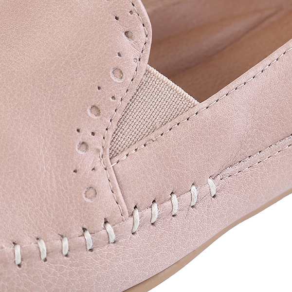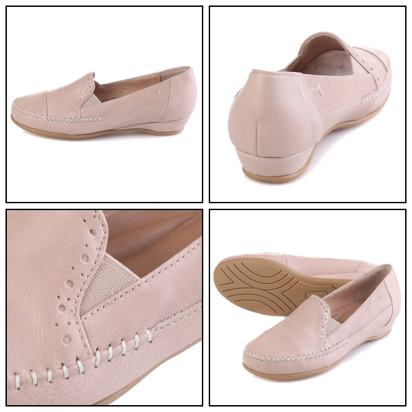 사이드의 탄력 밴드와 가죽 내피를 사용하여 발을 부드럽게 감싸주며, 안정적인 쉐입의 2cm 스폰지 베다굽과 복원력이 우수한 쿠션 인솔을 사용하여 발의 피로를 덜어 줌.