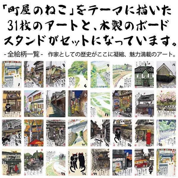 「町屋のねこ」をテーマに描いた31枚のアートと、木製のボードスタンドがセットになっています。