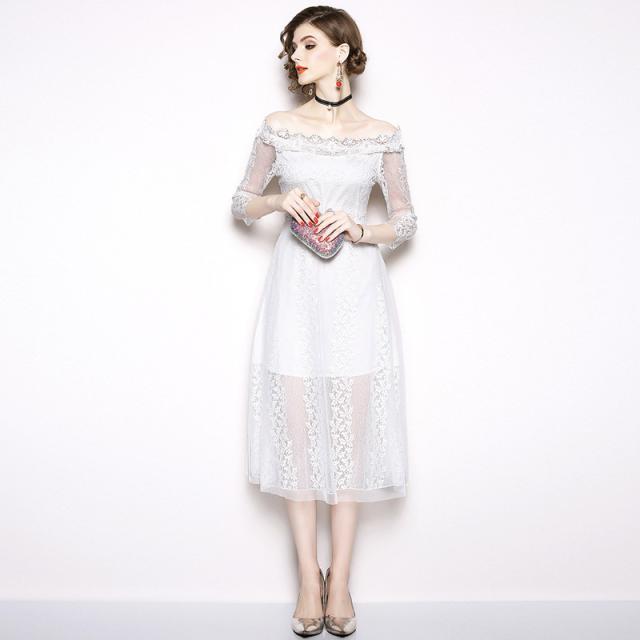総レースのオフショルダーのフィットアンドフレアドレス。