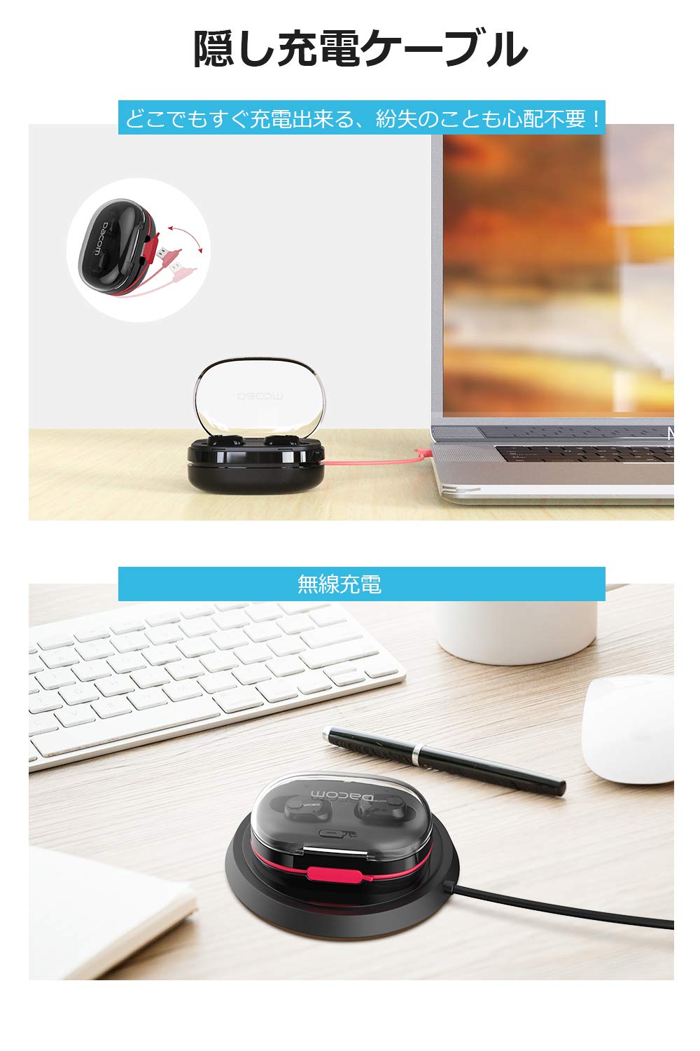 ✔【完全ワイヤレス イヤホン】世界で第一のワイヤレス充電できるイヤホンです。ワイヤレス充電器に置くだけで充電が始まる。完全的にワイヤレスを実現しました。✔【USBケーブル 充電】該当商品はUSB充電も支持致します。ケーブルは収納できるデザインですから、どこでも自由に充電できます、超便利です。煩わしいケーブルの拘束から完全開放!