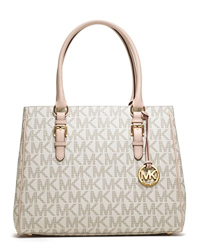 Michael Kors Jet Set Medium MK Signature Work Tote Bag Color: Vanilla Material: PVC -Beige leather handles with gold buckle hardware -Gold MK charm -Button snaps on the sides of bag -Magnetic button strap inside top of bag -Internal zipper compartment/cell phone pocket and open pocket -Another internal zipper compartment on the other side of bag with button snap -Beige leather piping trim on both sides of bag -Four gold buttons on the bottom of the bag This bag is ideal for work or formal occasions.