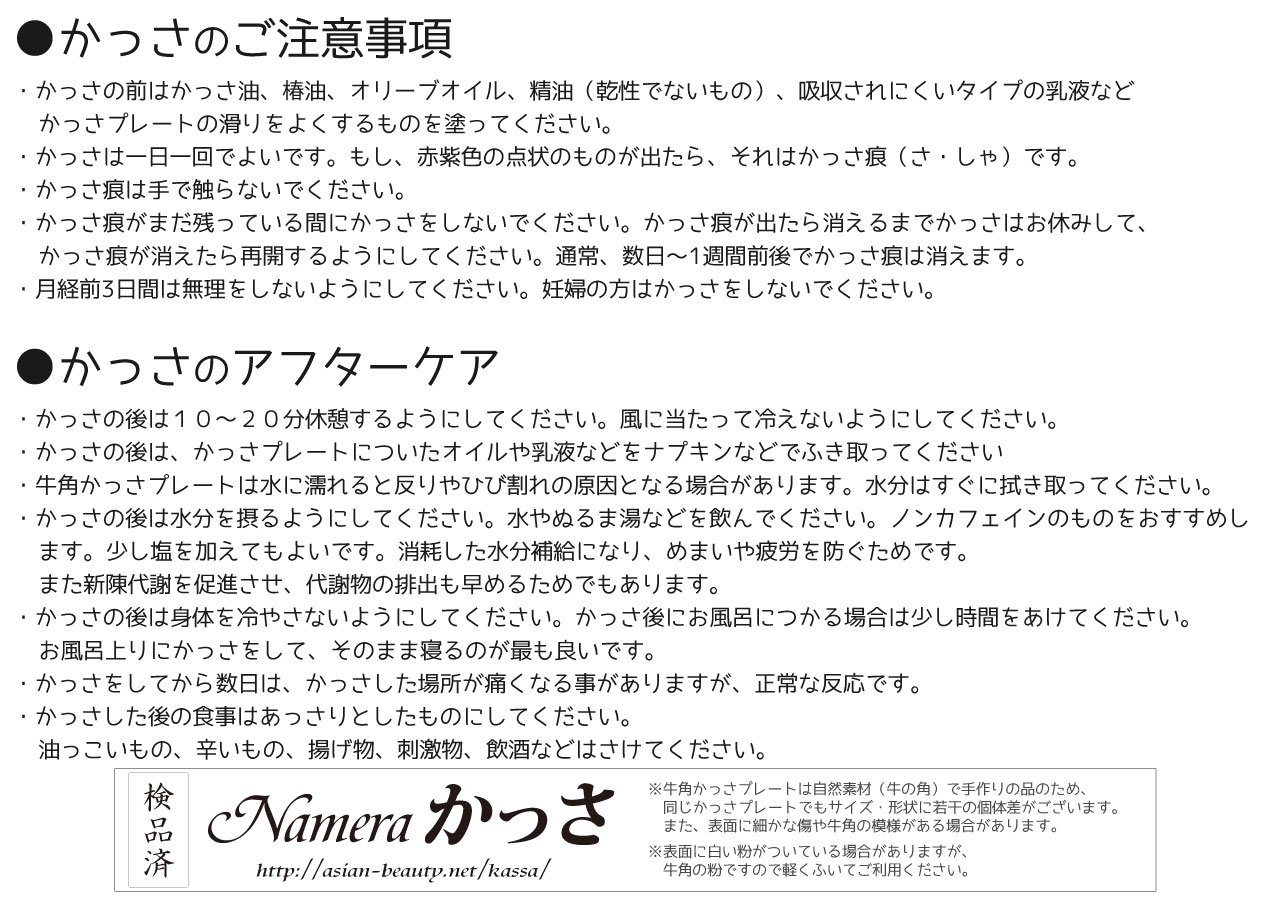 牛角かっさプレートは自然素材(牛角)で手作りの品のため、同じかっさプ レートでもサイズ・形状に若干の個体差がございます。また、表面に細かな傷や 牛角の模様がある場合があります。表面に白い粉がついている場合がありますが、牛角の粉ですので軽くふいてお使いいただきますようお願い申し上げます。