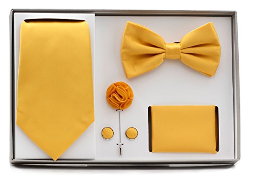 -. Feature : ModeMen's 5 Piece Matching Box Setrn Velvet Style / 1 Tie / 1 Pre-Tied Bow Tie / 1 Matching Flower Lapel Pin / 1 Set of matching cufflinks