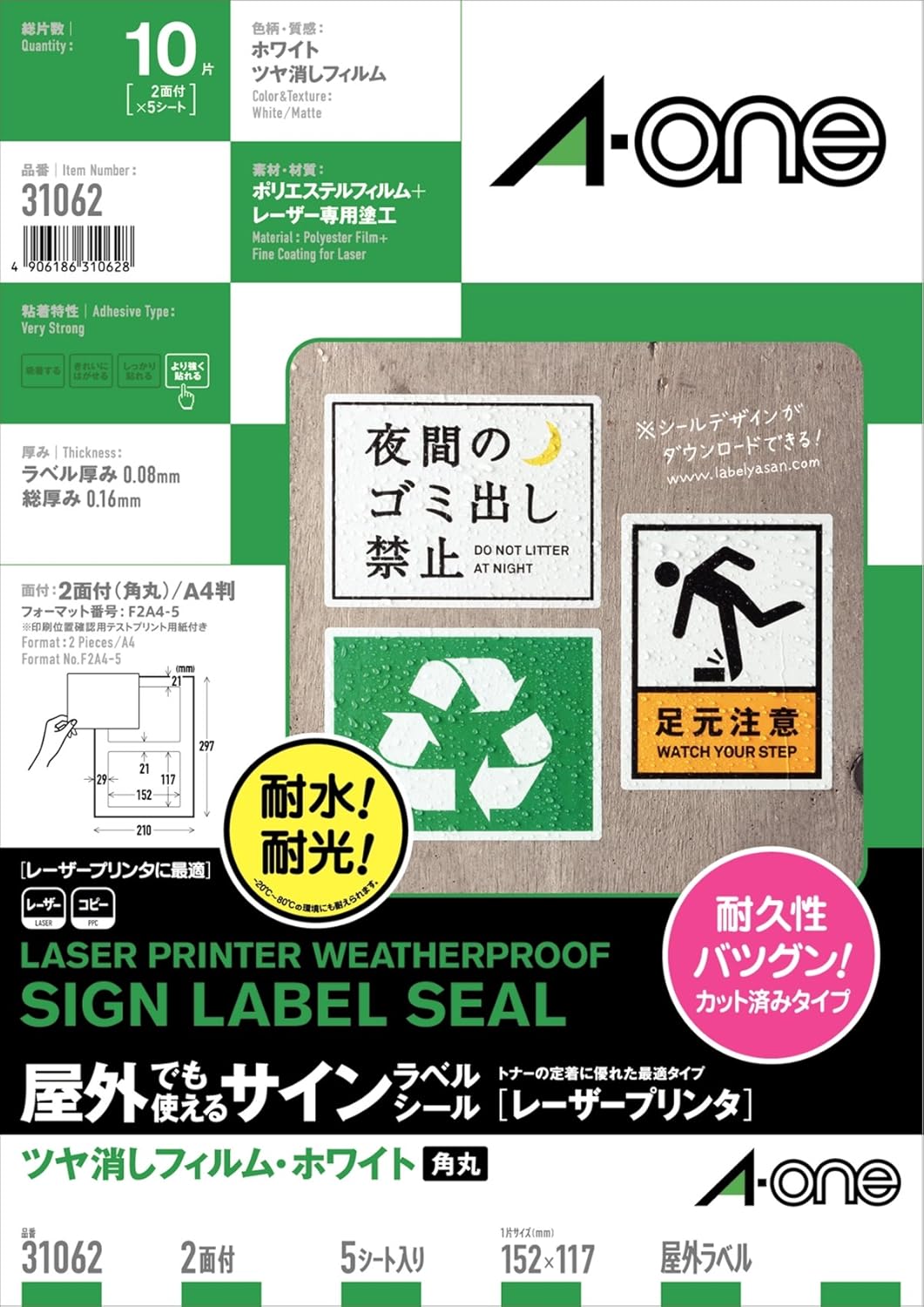 ツヤ消しフィルム・ホワイト/材質:ポリエステルフィルム/標準総厚み:0,16mm/ラベル厚み:0.084mm A4 2面(1列×2段)/シートサイズ:A4判(210mm×297mm)/ラベルサイズ:152mm×117mm(1列×2段) 対応プリンタ: レーザー コピー